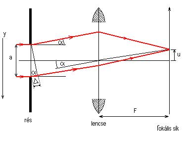 Az egyszerűség kedvéért egy keskeny, szélességénél jóval hosszabb, így gyakorlatilag végtelen hosszúnak tekinthető rést vizsgálunk, melynek síkjára merőlegesen párhuzamos sugárnyaláb esik. Az eredeti iránnyal a szöget bezáró irányban haladó szélső sugarak között az útkülönbség: